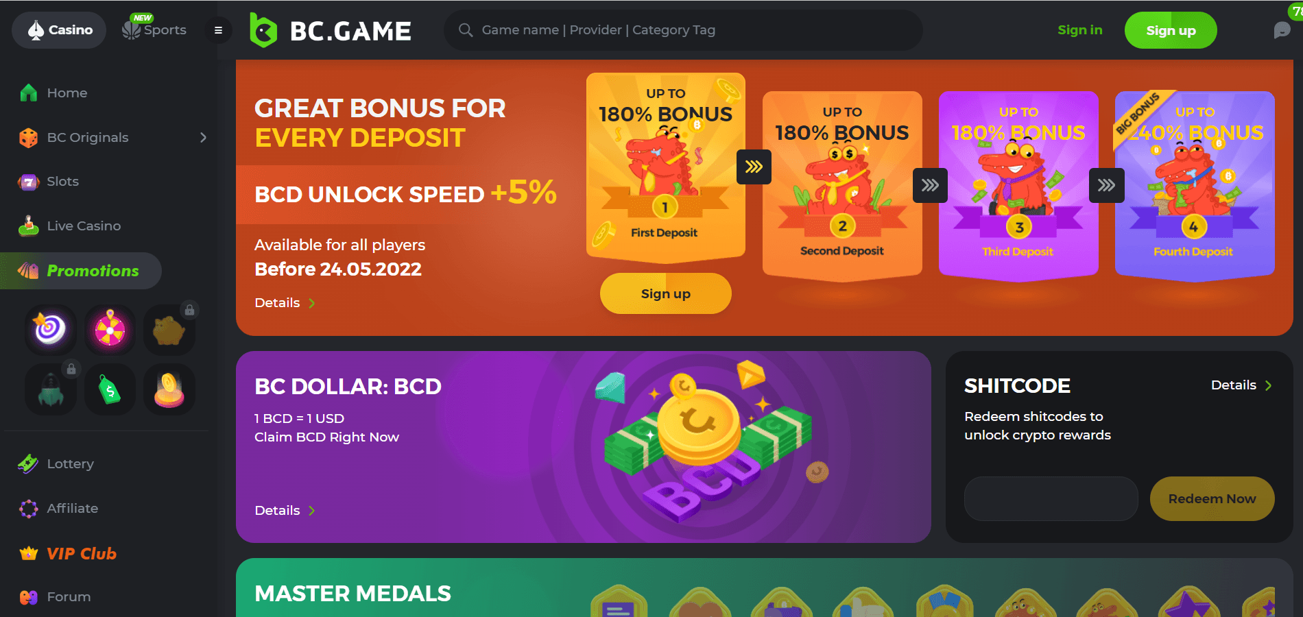 Oferta promocyjna kasyna BC.Game w zdecydowany sposób bazuje na dopłatach do depozytów. Darmowe spiny są tutaj dostępne tylko w ramach programu VIP, a i to dopiero na wyższych poziomach. Specyfiką kasyna są także specjalne bonusy za „odblokowanie” niektórych kryptowalut, a także unikatowe bonusy z kodów „Shitcode”. W zamieszczonej poniżej tabeli zamieszczamy informacje o głównych bonusach dostępnych w kasynie bez depozytu BC.Game. Jednocześnie musimy zastrzec, że kasyno niestety nie podaje dokładniejszych informacji na temat dodatkowych warunków swoich promocji, takich jak przykładowo maksymalne kwoty bonusów czy też wymagania związane z obrotem.
